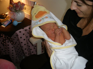 My water broke at 2:45 a.m on Dec. 31. When I went to bed that night I had a feeling that is was going to be my last night of being pregnant. I was a bit sad because I have enjoyed it so much but now that I have Macie I am glad to be a Mommy! Anyway, after getting to the hospital I was told that my water didn't break and I would be going home. Good thing my doctor checked because in fact I was right. After getting some medicine to start contractions around 9, I progressed quickly and by 12:30 I was completely dilated. I didn't begin pushing until 1:45 because my doctor had a c-section. Macie was then born by 2:30. Zack was an great coach. I was so impressed with how calm he was and how relaxed and comfortable he made me feel. Mom was in the room too and it was comforting to have her. She was the photographer when Macie arrived.