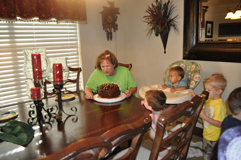 Nonnie was pretending to blow out the candles and make a wish. I forgot the candles. The kids didn't notice. They devoured their dinner so they could eat the chocolate cake. Macie saw the ingredients in the pantry and pulled them out so excited to make the cake. She kept saying, "We made a delcious cake for Nonnie." She told her friens and then when we got to the house Macie said to Jackson, "Look at the delicious cake we made." His response was "I love chocolate."